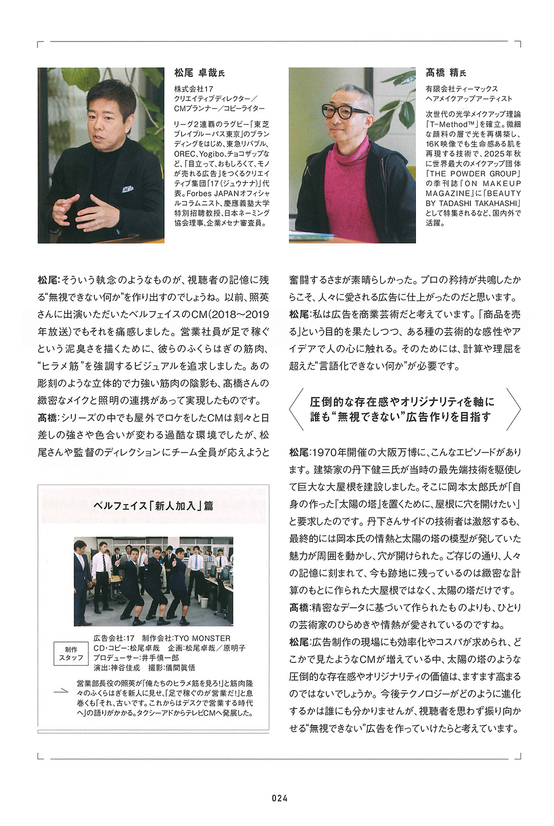 インフォメーション 2026/04/17 CM INDEX 4月号に対談記事が掲載 CM INDEX 2026年4月号「広告の今を語る」にて、 ヘアメイクアップアーティストの髙橋精さんとの対談記事が掲載されました。